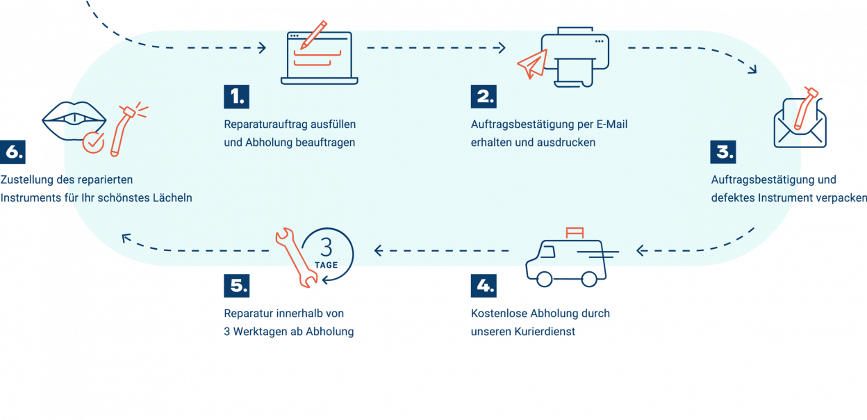 Unser Express-Service für Turbinen, Winkelstücke und Motoren genauso wie für Scaler, Pulverstrahl- oder Lichtstrahlgeräte ist für Sie da. Die Instrumente werden per Kurier abgeholt, von unseren erfahrenen Technikern demontiert, gereinigt, geprüft, montiert und endkontrolliert – und schnellst-möglich wieder zu Ihnen in die Praxis geliefert. Das Fabrikat ist dabei nebensächlich: Regelmäßige Schulungen sorgen dafür, dass wir optimal auf jegliche Reparaturen vorbereitet sind. Profitieren Sie von diesem vorteilhaften Service und helfen Sie uns dabei, ein klares Statement für die Nachhaltigkeit und gegen den Wegwerfwahn zu setzen.